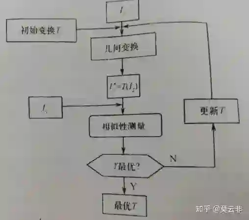 I1,I2是待配准两副图像提取特征后得到的特征空间,也可以将原图所有像素作为特征空间,此时的I1,I2就是待配准的两张图像;我们选择一个合适的变换模型(比如仿射变换),将I2变换后得到I2*,选择合适的相似性测度计算I2*和I1的相似度,我们希望这个相似度越小越好,因此需要采用一种优化策略(或者说优化算法)来迭代优化目标函数相似度,找到合适的几何变换参数使得相似度最小。一些人工设计的相似性测度经常被使用,比如平方和误差(SSD),互相关函数(CC),互信息(MI),标准互相关函数(NCC),标准互信息(NMI)。