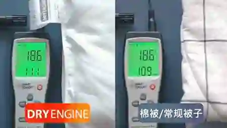 从上方视频中我们可以看到,测试前的室内湿度值大约是11%RH,将探测棒分别放入两床被子后,两边的数据产生了惊人的对比:普通棉被的内部湿度几乎是干燥势能被的一倍!常规被子的潮湿正是造成被窝冰冷的重要元凶。