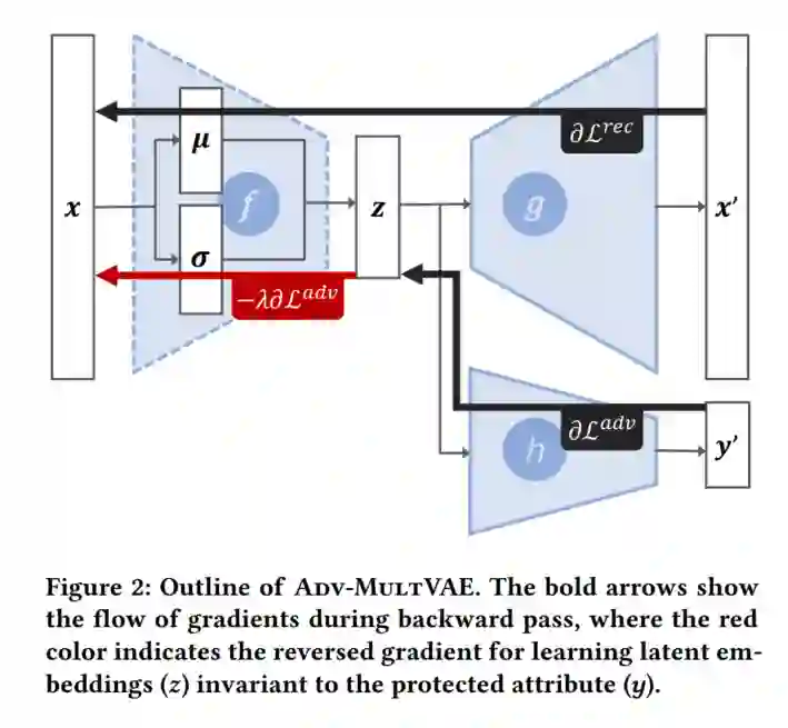 本文的训练过程旨在从中间特征中删除受保护属性的信息,同时并保持推荐性能。为此,模型的损失函数被定义为以下最小-最大博弈问题: