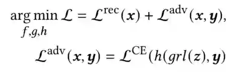 考虑到众所周知的优化min-max损失函数的复杂性,受前人工作的启发,本文在对抗网络 和中间变量 之间添加了一个梯度反转层 。在训练过程中, 在前向传播中充当恒等函数,而在反向传播中,它将计算出的梯度缩放为 。 在推理时对模型没有任何影响。本文把参数𝜆称为梯度反转缩放。通过在模型中采用 ,模型的整体损失就可以被重新表述为标准的风险最小化的基本设置,因此可以达到快速收敛的目的。