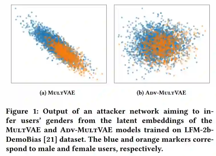 协同过滤算法除了捕捉用户潜在的消费模式外,还会学习用户特定的人口统计学特征或受保护信息等特征,如性别、种族和地理位置位置。这些偏见(Bias)信息会进一步影响推荐系统(RS)的决策,使得推荐算法会提供给不同用户子群的内容进一步分离,这将引起对用户受保护属性泄露的隐私问题。通过观察下图,可以发现基本的推荐算法(MultVAE)存在性别上的偏差,使得攻击者可以很容易的识别这种模式并进行敏感属性的推测。