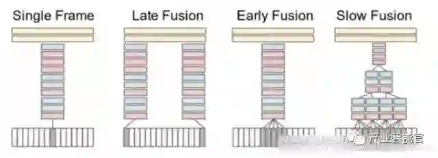 这类方法将视频视为一系列帧图像,网络接收属于视频的一组多帧图像(例如15帧),然后从这些图像中提取深度特征,并最终集成这些图像特征以获得视频的该部分的特征以对其进行分类。实验表明,使用“慢速融合(slow fusion)”效果最佳。此外,独立组织单个帧也可以得到非常有竞争力的结果,这意味着来自单个帧的图像包含大量相关信息。