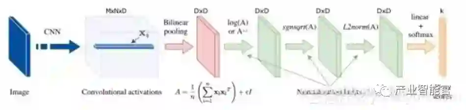 首先计算卷积描述符的外积,以找出不同维度之间的相互关系。因为不同描述符的维度对应于卷积特征的不同通道,并且不同的通道提取不同的语义特征,所以使用双线性操作允许我们捕获输入图像上的不同语义元素之间的关系。