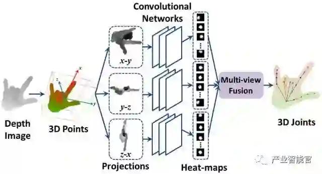 针对手势姿态估测问题,新加坡南洋理工大学提出将深度图像投影至三个正交平面,针对每个投影训练CNN模型并将结果融合。首尔大学提出体素3D CNN网络V2V-PoseNet对3D体素网格预测手部关节位置。此外,南洋理工大学还提出将3D点云和表面法线作为输入,训练3D深度学习网络预测手部关节。