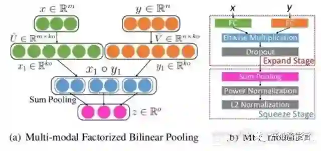 该方法使用视觉特征向量和文本特征向量的外积来捕获每个维度上这些状态的特征之间的关系。为了避免明确地计算双线性汇合的高维度结果,我们可以将在细粒度识别中发现的流线型双线性汇合背后的思想应用于视觉问题回答。例如,MFB使用低速率近似背后的概念以及视觉和文本注意机制。