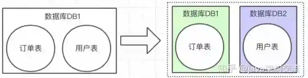 垂直拆分比较简单,也就是本来一个数据库,数据量大之后,从业务角度进行拆分多个库。如下图,独立的拆分出订单库和用户库。