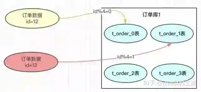hash的方案就是对指定的路由key(如:id)对分表总数进行取模,上图中,id=12的订单,对4进行取模,也就是会得到0,那此订单会放到0表中。id=13的订单,取模得到为1,就会放到1表中。为什么对4取模,是因为分表总数是4。