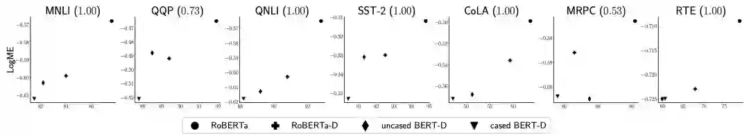 LogME并不局限于视觉模型与任务,我们还测试了它对NLP预训练模型的评价能力。可以看到,在五个任务上,LogME完美地预测了四个预训练模型的表现的相对大小,在另外两个任务上的表现也不错。