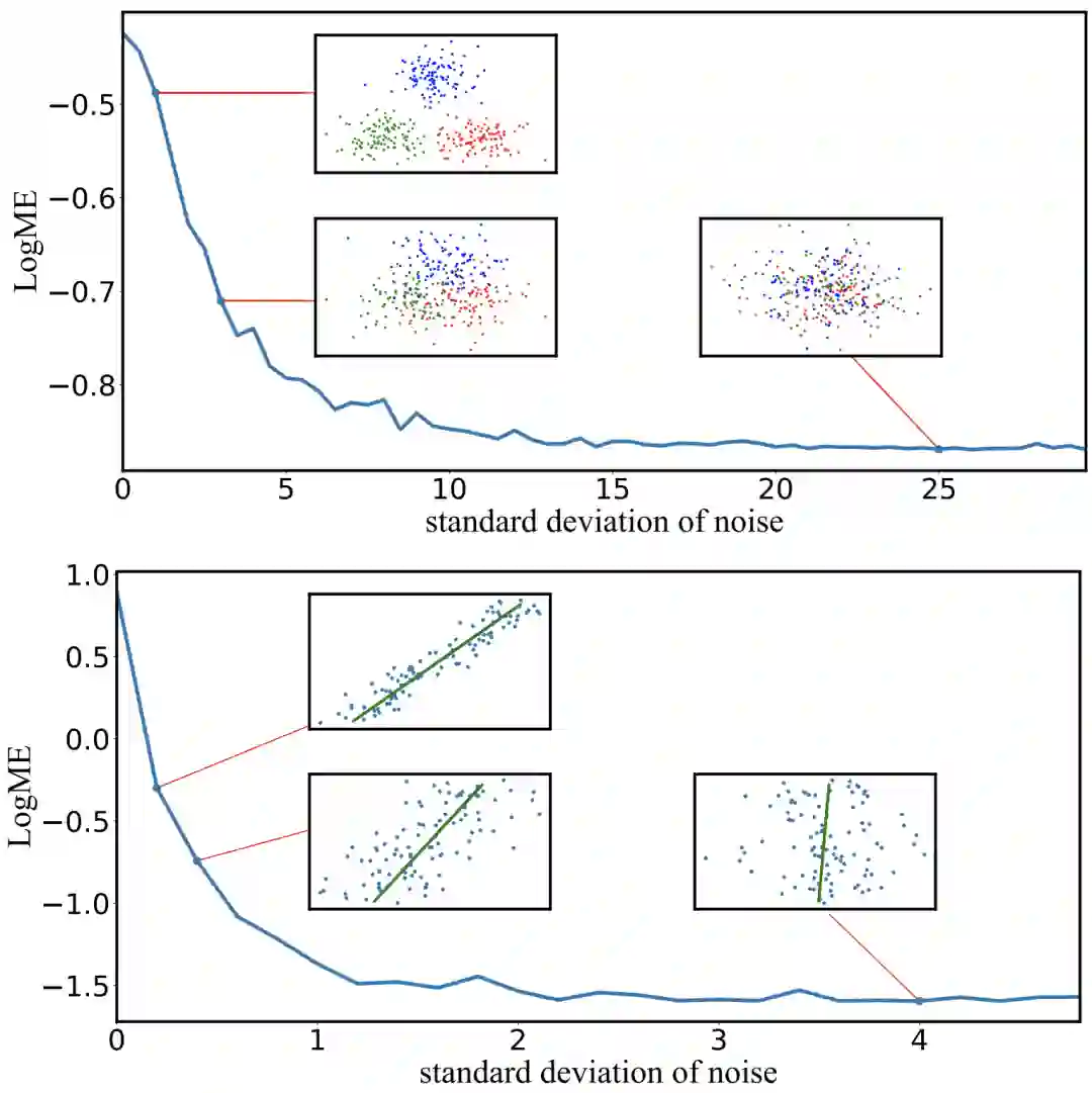 首先让我们看看,LogME给出的打分标准与人的主观感觉是否一致。我们为分类问题和回归问题分别设计了一个toy实验,使用生成数据来测量LogME的值。从下图中可以看出,不管是分类任务还是回归任务,当特征质量越来越差时,LogME的值也越来越低,说明LogME可以很好地衡量特征与标注的关系,从而作为预训练模型选择的标准。