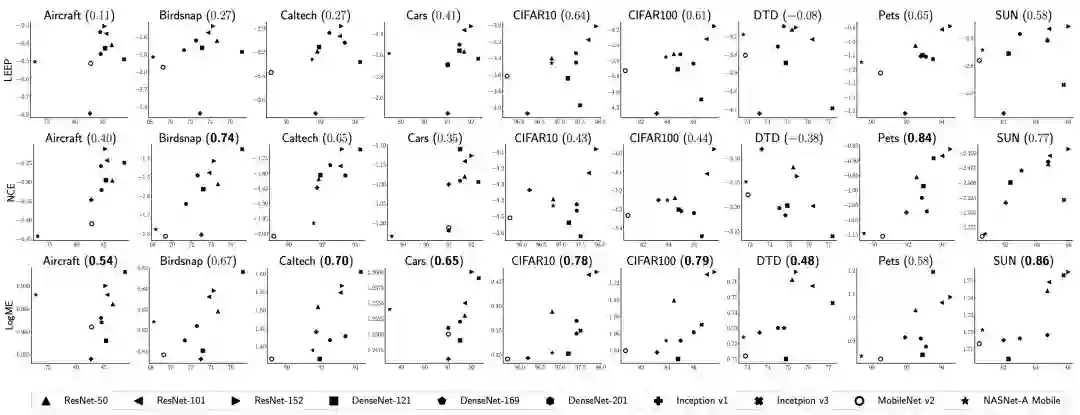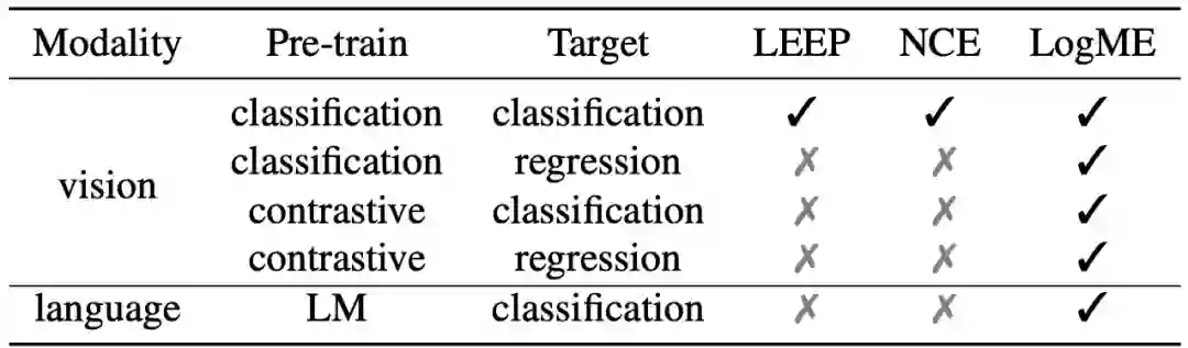 一个好的打分标准,需要在保持与ground-truth打分的高度相关性的同时,尽可能降低时间开销,才能满足实际使用的要求。除了ground-truth方法之外,目前还有两种打分方法(LEEP和NCE),但是它们的使用范围非常有限,只能用于有监督预训练模型迁移到分类任务的场景,如下表所示,而我们提出的LogME则能够胜任几乎所有常见的场景,覆盖了视觉、NLP、分类、回归、有监督预训练模型、无监督预训练模型等方向。