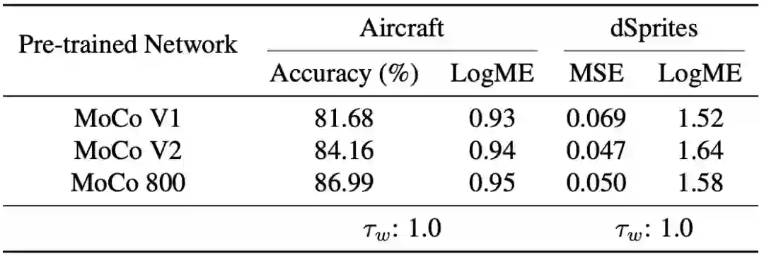 在2020年,视觉领域的重要进展之一就是无监督预训练模型。因此我们也尝试了使用LogME来判断无监督预训练模型的质量。从下图的结果来看,不论是分类任务(Aircraft)还是回归任务(dSprites),LogME都能准确衡量无监督预训练模型的质量。