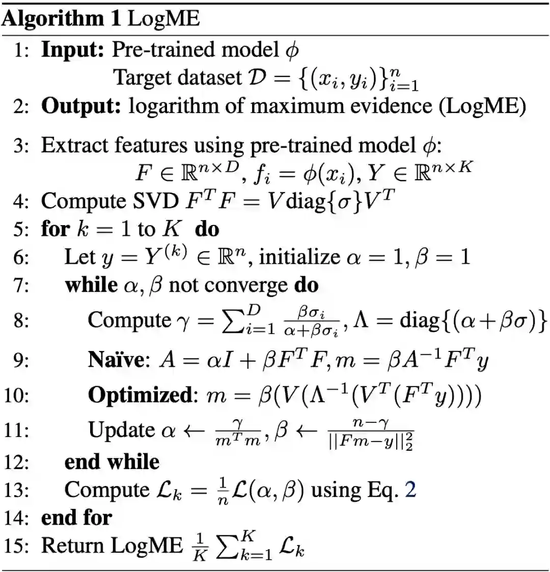 我们选用的是统计学中的证据(evidence,也叫marginalized likelihood)来衡量特征与标注的关系。它不使用某个特定的 的值,而是使用的分布来得到边缘化似然的值。它相当于取遍了所有可能的 值,能够更加准确地反映特征与标注的关系,不会有过拟合的问题。其中, 与 分别由超参数 和 决定,但是它们不需要grid search,可以通过最大化evidence来直接求解。于是,我们就得到了对数最大证据(Log Maximum Evidence, 缩写LogME)标准来作为预训练模型选择的依据。具体数学细节不在这里赘述,感兴趣的读者可以阅读底部的论文。算法的具体细节在下图中给出了。注意,虽然LogME计算过程中将预训练模型 视作特征提取器,但是LogME可以用于衡量 被用于迁移学习(微调)的性能。
