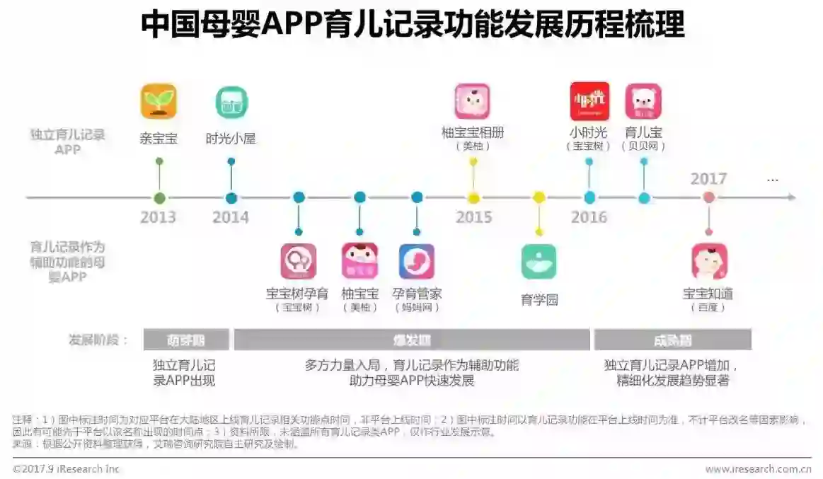 在需求侧的驱动下,独立育儿记录APP不断涌现,同时,部分综合母婴社区也纷纷开设育儿记录功能。2013年,育儿记录APP亲宝宝上线,2014年,时光小屋、宝宝树孕育等多个APP也渐次推出育儿记录功能。经历过作为辅助功能推动母婴APP发展的爆发期,2016年以后,育儿记录功能进入了以精细化发展为主的成熟期,独立育儿记录APP数量增加。