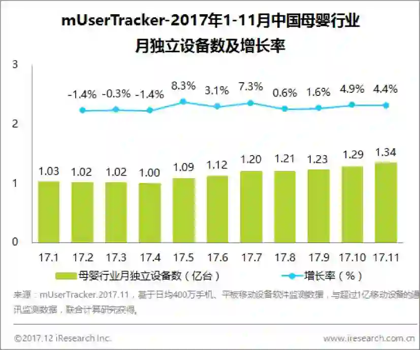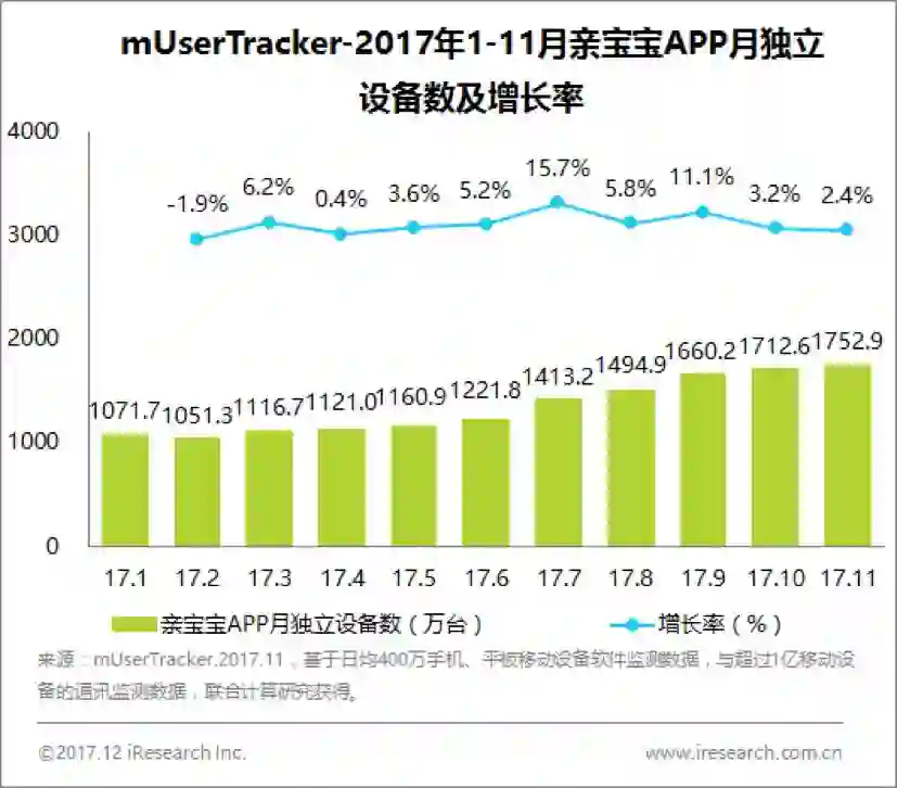 亲宝宝作为育儿记录行业的典型头部玩家之一,2017年以来,其月独立设备数持续增长,至11月已达到1752.9万台,整体增幅63.6%,月度环比增长率一度超过15%。