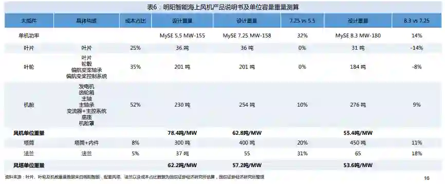 以明阳智能海上风机系列产品为例,如图1,当风机从5.5MW升级到8.3MW,尽管配套的叶轮直径从155米放大到180米,但整体物料成本依然有明显下降,单位容量的成本得到有效降低。