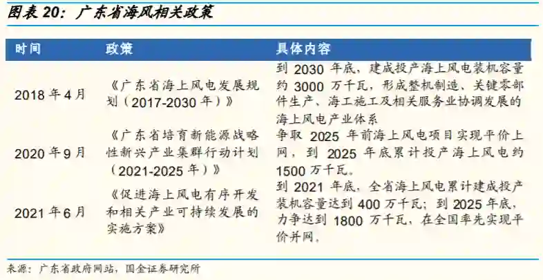 与此同时,尽管在平价上网压力下,国补已经进入尾声,但考虑到我国海上风电目前远未达到平价上网的要求,因此预计地方补贴将会接力国补成为海上风电加速发展的重要资金来源。广东作为海上风电发展大省,自2018年起不断出台相关利好政策,并明确提出了具体的地方补贴政策。即2022-2024年每千瓦补贴分别为1500元、1000元、500元。