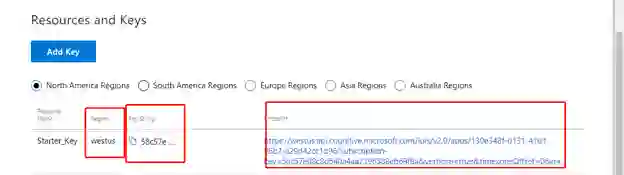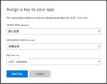 回到 LUIS 的发布页面,翻到最下面的 Resources and Keys,切换到 Asia Regions,点击 Add Key 按钮。