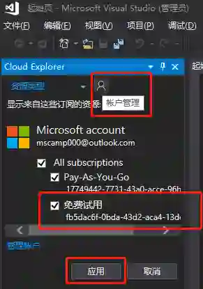在视图菜单中,选择 Cloud Explorer,如下图点击账户管理,确保可以刷出你的订阅,如果没有刷出,请尝试重启 Visual Studio 并稍后再试。