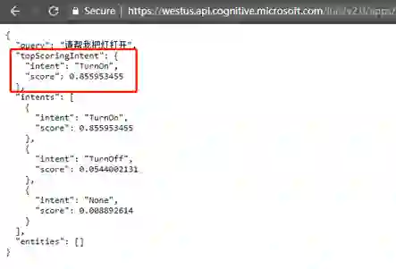 要注意这里的终结点是以“q=”结尾的,需要在终结点的最后拼上要测试的语句,比如“请帮我把灯打开”,得到一个完整的链接,然后再从浏览器里打开,就可以看到识别后的结果。