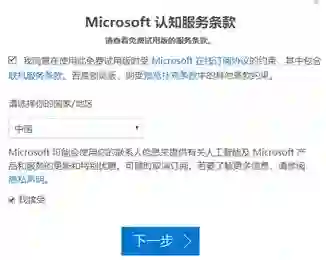 在服务条款页面勾选同意,选择国家/地区为中国,下一步