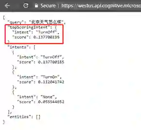 在上一步发布的终结点最后拼上一个新的语句“北京天气怎么样”,然后在浏览器进行测试,可以发现最终 topScoringIntent 是TurnOff,这显然是不对的,而且得分只有 0.14,和其它几个意图的得分差不多。