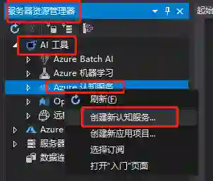 在视图菜单中,选择服务器资源管理器,找到 AI 工具,在 Azure 认知服务上点右键,创建新认知服务。