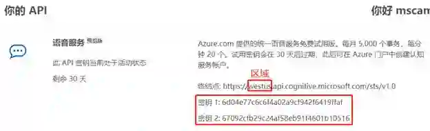 后面要在程序中调用语音转文本服务,必须要有服务密钥才可以。试用密钥的有效期是 30 天,每月 5000 个事务,每分钟 20 个。每个账号只能申请一次试用。