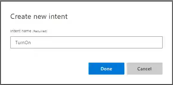在弹出窗中输入意图的名称,这里使用 TurnOn 表示开灯的意图,完成后点击 Done。注意这里意图的名称在后面程序中会用到,拼写及大小写要保持前后一致。