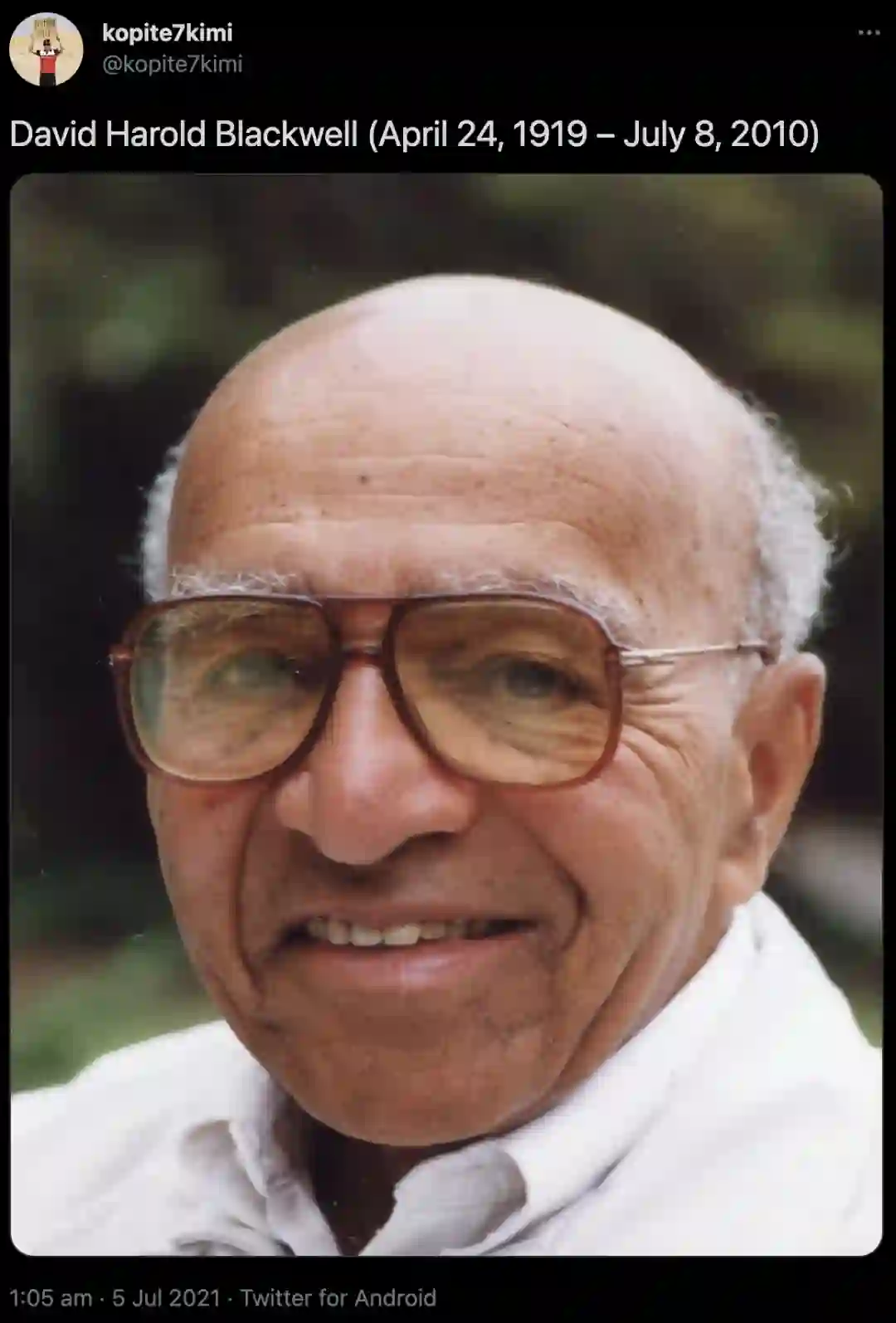 David Harold Blackwell(1919-2010)是美国统计学家和数学家,对博弈论、概率论、信息论和统计学做出了重大贡献。