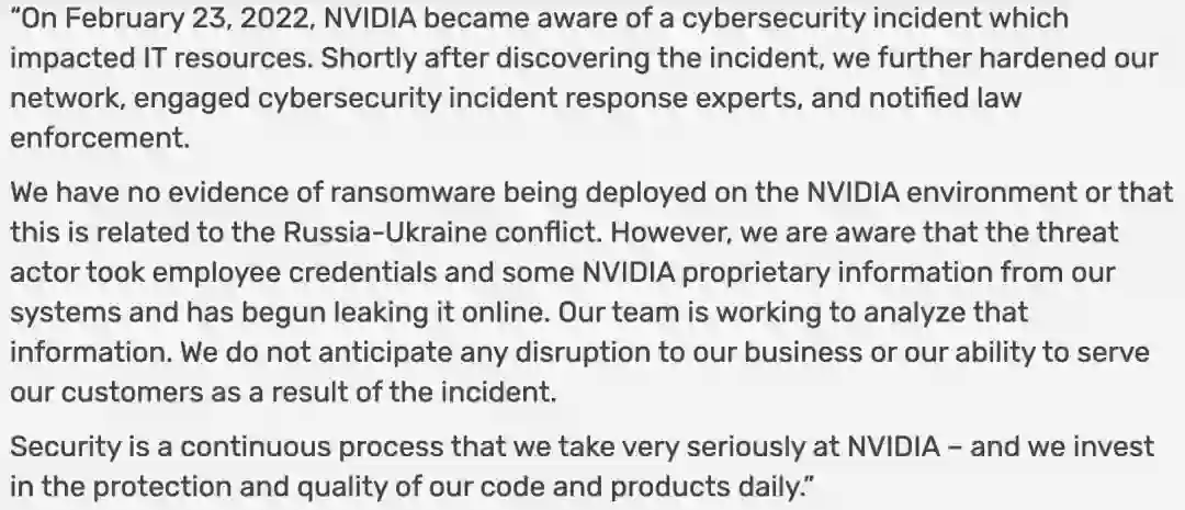 在回复VentureBeat、PCMag等媒体的问题时,英伟达官方用统一的电邮回复:「在发现被黑后不久,本公司就加强了网络防范、咨询了网络安全事件应对专家,并通知了执法部门。