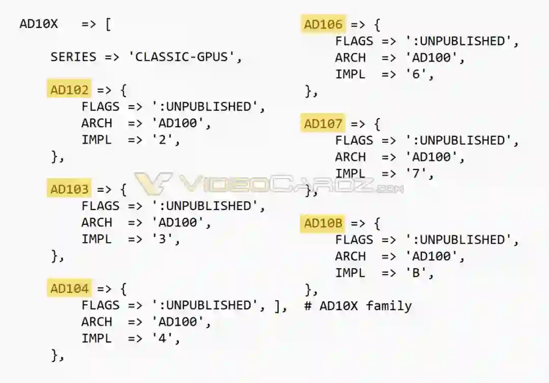 Ada将作为英伟达安培显卡的后续产品,其中型号包括,AD102、AD103、AD104、AD106、AD107和AD10B(不是108)。