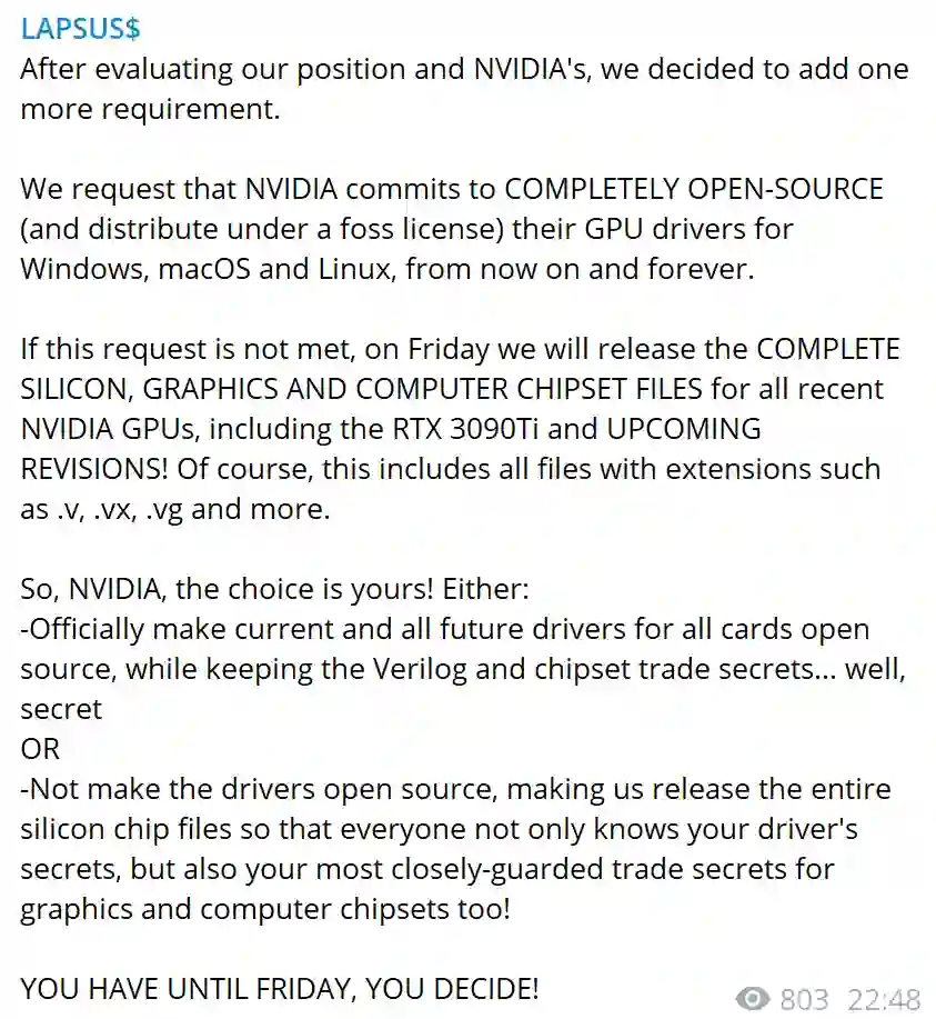 3月1日,Lapsus$称「考虑到我方和英伟达方面的各自立场」,要求英伟达将所有已发布和未来显卡的Windows、MacOS、Linux各版本驱动在FOSS项目协议下永久全部开源。