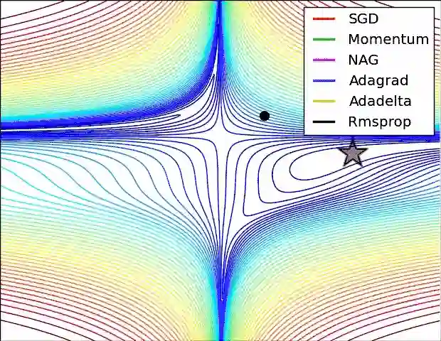 从上图可以看出,在鞍点(saddle points)处(即某些维度上梯度为零,某些维度上梯度不为零),SGD、Momentum与NAG一直在鞍点梯度为零的方向上振荡,很难打破鞍点位置的对称性;Adagrad、RMSprop与Adadelta能够很快地向梯度不为零的方向上转移。