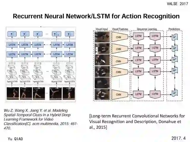 在解决这个短时的视频行为识别问题后,人们越来越关注长时的序列,自然就考虑把递归神经网络(RNN、LSTM)这些模型用于时序建模。常见的方式是,使用卷积神经网络(CNN)提取图像帧的特征,把CNN抽取的特征送到长短期记忆网络(LSTM)中去,然后做分类,这个框架也是后来很多做video caption工作的一个基础。
