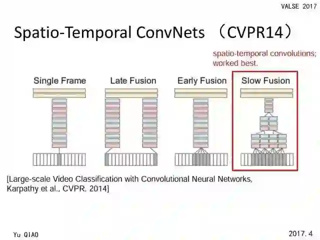 在2014年,受卷积神经网络在图像分类领域取得的成功的启发,大家开始考虑把卷积神经网络用于视频分类,但是,早期通过微调在ImageNet数据集上训练的网络获得的结果都不太好,大概有5到6个点的识别率的提高。当时大家的一个共识就是数据量不够,这时谷歌就建立了一个100万的数据库,叫做Sports-1M。在这个数据库上,他们通过融合卷积神经网络特征的方法构造了几种融合(fusion)策略,但是这个方法的结果并不是很好,比如说,当时这个方法在UCF101的识别率只有百分之六十几。