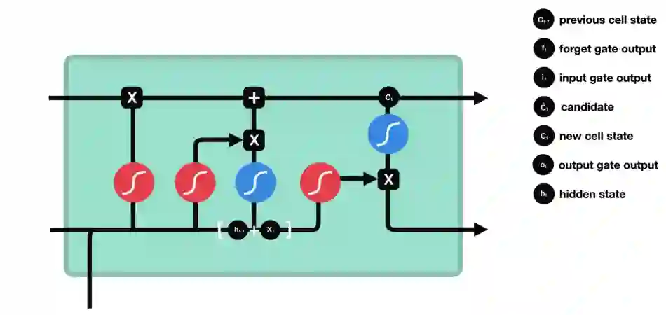 每个门都包含sigmoid激活,它和Tanh的主要区别是取值范围在0到1之间,而不是-1到1。这个特点有助于在cell中更新、去除数据,因为任何数字乘以0都是0(遗忘),任何数字乘以1都等于它本身(保留)。由于值域是0到1,神经网络也能计算、比较哪些数据更重要,哪些更不重要。