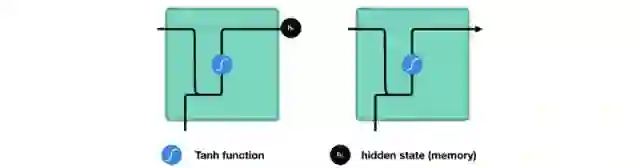 那么这个隐藏状态是怎么计算的?让我们看看RNN的第一个cell。如下图所示,首先,它会把输入x和上一步的隐藏状态组合成一个向量,使这个的向量具有当前输入和先前输入的信息;其次,向量经tanh激活,输出新的隐藏状态。