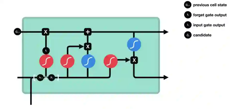 首先,我们来看3个门中的遗忘门。这个门决定应该丢弃哪些信息。当来自先前隐藏状态的信息和来自当前输入的信息进入cell时,它们经sigmoid函数激活,向量的各个值介于0-1之间。越接近0意味着越容易被忘记,越接近1则越容易被保留。