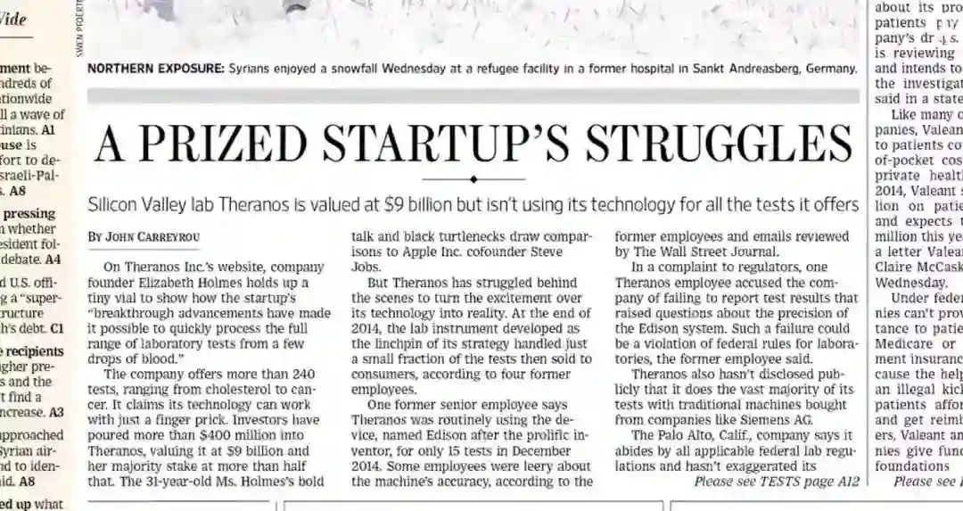John Carreyrou首先在其供职的TheWall Street Journal发了头版报道揭露真相