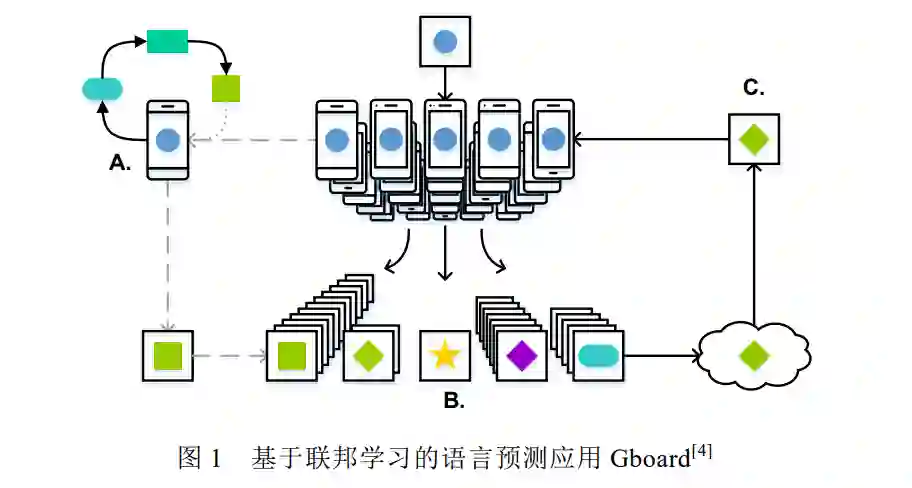 近年来,个人数据泄露的事件层出不层,如 2018 年 Facebook 数据泄露事件等.这些事件引起了国家和公众 对于个人隐私保护的关注.各个国家都开始出台数据隐私保护相关的法律法规,如欧盟 2018 年 5 月 25 日出台 的《通用数据保护条例》(General Data Protection Regulation,简称 GDPR) [2],以及中国 2017 年实施的《中华人 民共和国网络安全法》等.这些法律法规要求公司企业必须在用户同意的前提下才可以收集个人数据,且需要 防止用户数据泄露.此外,个人隐私保护意识的兴起也导致用户不愿轻易共享自己的隐私数据.严格的法律法规 和个人隐私保护意识导致训练数据的收集愈发困难,为集中学习提出了巨大的挑战. 为应对上述两个问题,联邦学习(federated learning)应运而生.联邦学习,又名联盟学习或联合学习,是一种 由多个客户端和一个聚合服务器参与的分布式机器学习架构.客户端既可以是个人的终端设备(如手机等),也 可以代表不同的部门或企业,它负责保存用户的个人数据或组织的私有数据.客户端在本地训练模型,并将训练 后的模型参数发送给聚合服务器.聚合服务器负责聚合部分或所有客户端的模型参数,将聚合后的模型同步到 客户端开始新一轮的训练.这种联合协作训练的方式可以在保证模型性能的前提下,避免个人数据的泄露,并有 效解决数据孤岛的问题. 联邦学习自 2016 年谷歌[3]提出后便引起学术界和工业界的强烈关注,并涌现出许多实际应用,如谷歌最初 将其应用在安卓手机上的 Gboard APP(the Google Keyboard,谷歌键盘输入系统),用于预测用户后续要输入的内 容(如图 1 所示) [4].用户手机从服务器下载预测模型,基于本地用户数据进行训练微调,并上传微调后的模型参 数,不断优化服务器的全局模型.此外,联邦学习也被广泛应用于工业[5,6]、医疗[7–11]和物联网[12]等领域.