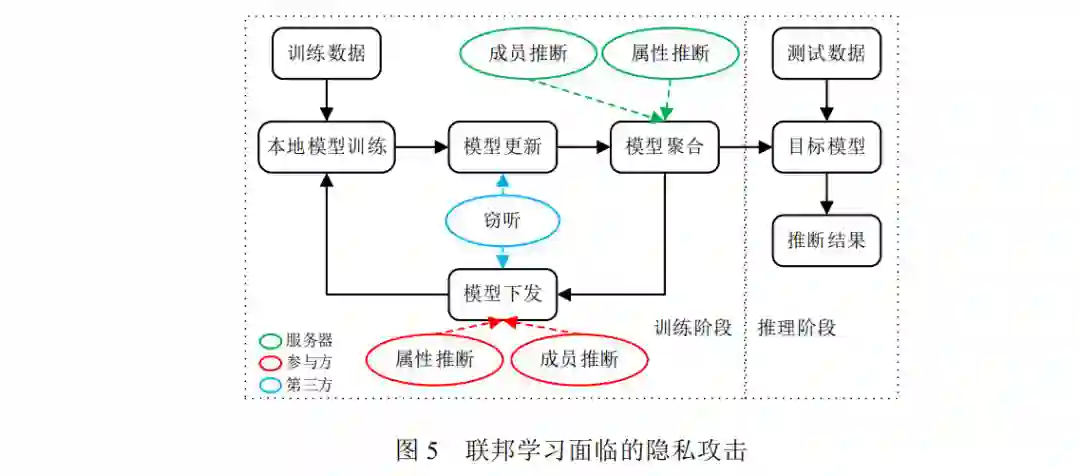 虽然联邦学习通过参与方和服务器交换模型参数的方式保护了参与方的本地数据,但是学者研究发现交 换的模型梯度也可能泄露训练数据的隐私信息[109,110].对于集中学习,模型倒推(model inversion)攻击可以从模 型中反推训练数据的属性值[111],这同样也适用于联邦学习的全局模型.而联邦学习的训练机制也为隐私引入了 新的风险: (1) 联邦学习的模型信息对攻击者是可见的,攻击者可以实施白盒隐私攻击. (2) 联邦学习的训练包含多轮迭代,攻击者可以利用模型在迭代过程的变化挖掘更多的数据信息. (3) 攻击者可以通过参与方或服务器干扰模型训练过程,修改模型参数,使正常参与方在后续迭代中暴露 更多本地数据信息. 因此许多学者专门针对联邦学习存在的隐私风险与保护方法进行研究.本文以联邦学习面临的隐私攻击 的发生逻辑和顺序对目前主要研究的攻击手段进行分类(如图 5 所示),具体分为成员推断攻击[112–115]、属性推 断攻击[16,112,116–122]和窃听.根据攻击者角色的不同,隐私攻击发生在联邦学习的不同阶段,如服务器是在模型聚 合阶段发动隐私攻击.注意,在图 5 的推理阶段可以实施集中学习的隐私攻击手段,这部分不在本文讨论范围内.
