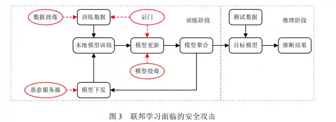 在集中学习的发展过程中,许多学者对其安全性进行深入研究,发现其中存在的安全威胁,如训练阶段的投 毒攻击(poisoning attack) [19]和推理阶段的对抗样本攻击(adversarial examples attack)等[20].联邦学习的推理阶段 与集中学习一致,因此也会面临对抗样本攻击.而在训练阶段,联邦学习采用分布式计算的方法,为整个系统的 安全性研究引入了新的问题与挑战.本文主要总结面向联邦学习的安全威胁与防护方法,与集中学习相关的安 全研究不在本文的讨论范围内.