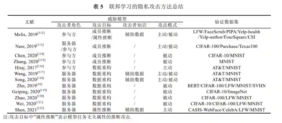 目前针对联邦学习的隐私攻击方法及其威胁模型如表 5 所示.另外,表 5 还总结每种攻击验证时 使用的数据集,包括图像领域的 CIFAR-100[40]、CIFAR-10[40]、MNIST[41]、AT&T[43]、LFW[125]、FaceScrub[126]、 PIPA[127]、BERT[128]、SVHN[129]、ImageNet[130]、CASIS-WebFace[131]和 CelebA[132],文本领域的 Yelp-health[133] 和 Yelp-author[133],以及其它领域的 Purchase[52]、FourSquare[134]、Texas100[135]和 CSI[136].