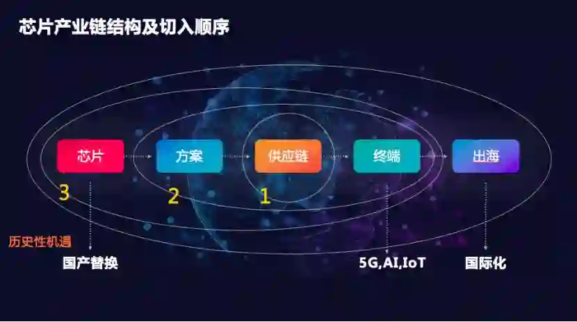 芯片超人的方法是从供应链开始,把自己从行业最大的IP,往产业上下游延伸,用爆款的应用方案带领下游的需求,把芯片带过去流通并且带领它们出海,走向国际市场,这是我们产业链的结构和切入顺序。