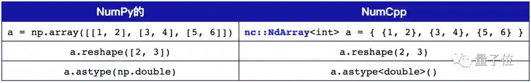 从上图可以看出,NumPy和NumCpp调用的函数名称几乎完全一致,除了在定义数据类型上有一些差别。需要注意的是NumpCpp中的创建一个数组调用的是NdArray,而Python上用的是array。