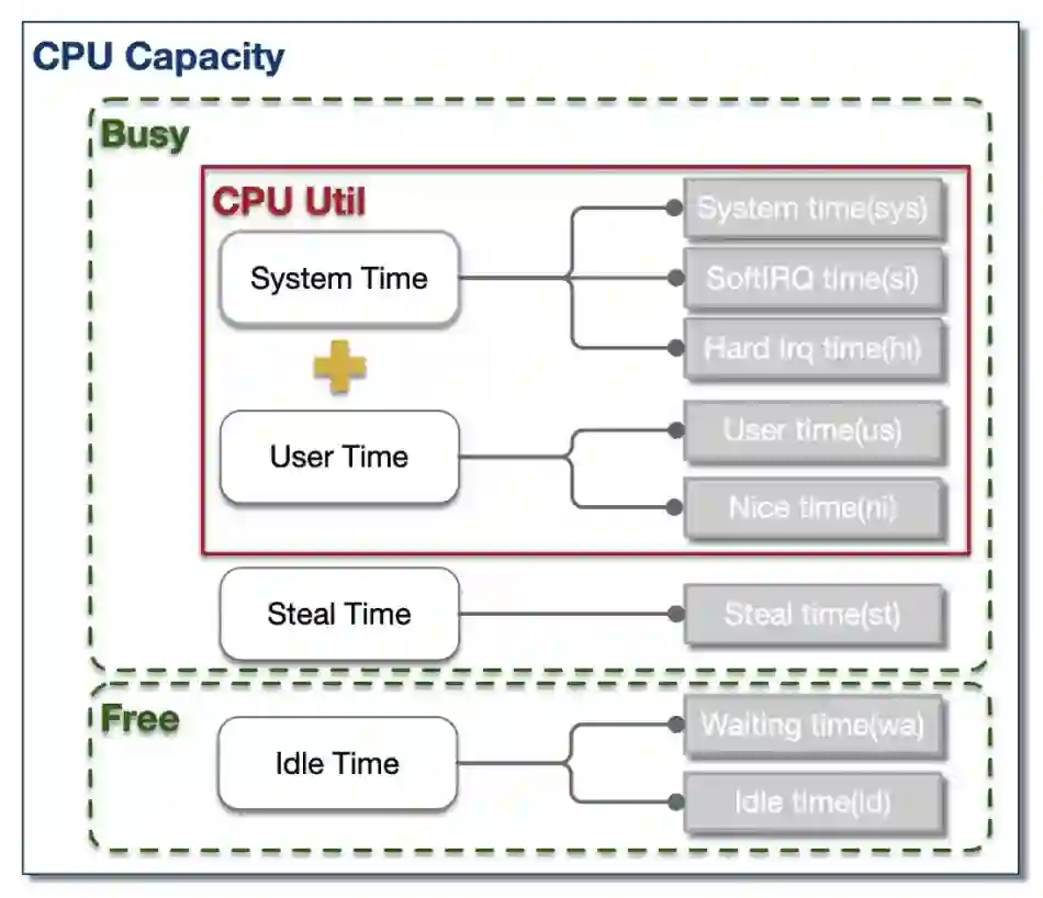 CPU的时间分片一般可分为4大类:用户进程运行时间 - User Time, 系统内核运行时间 - System Time, 空闲时间 - Idle Time, 被抢占时间 - Steal Time。除了Idle Time外,其余时间CPU都处于工作运行状态。