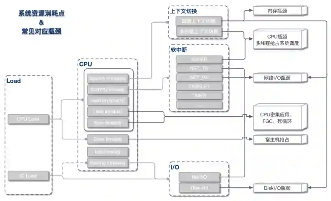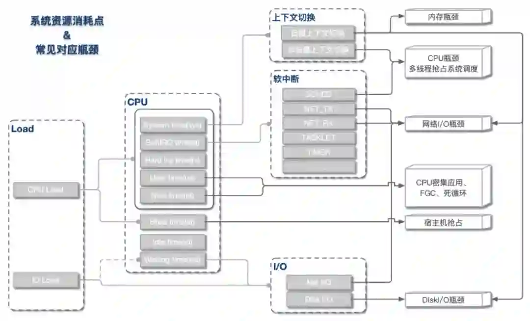 从上文我们了解到,Load Average和CPU使用率可被细分为不同的子域指标,指向不同的资源瓶颈。总体来说,指标与资源瓶颈的对应关系基本如下图所示。
