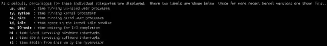 为了便于定位问题,大多数性能统计工具都将这4类时间片进一步细化成了8类,如下为TOP对CPU时间片的分类。