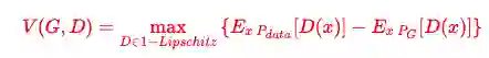 其实在GAN中,不一定非得用JS Divergence来衡量两个分布的逼近程度,任意一种Divergence都可以,于是有人提出了使用Earth Mover Distance来衡量两个分布,Earth Mover听起来像推土机,它的意思可以比喻成对于分布P是一个土堆,目标分布Q是一个土堆,如何把P土堆挪成Q土堆并且所耗距离最小.那么这种距离如何用数学表达式衡量呢?推导过程很复杂,结论如下,要找到一个符合特定条件的判别器,使得V(G,D)达到最大:
