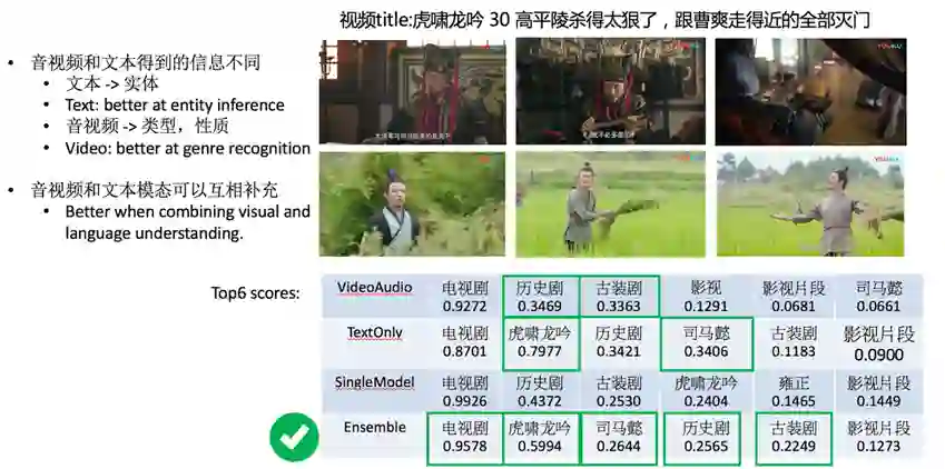 当然,音视频模态面临的一个严重问题是对于知识的提取能力有限,文本模态对于实体有更好的提取与推断能力。在下面的例子中,音视频模态会以更高的权重推断「古装剧」和「历史剧」,而文本模态则会推断「虎啸龙吟」与「司马懿」,最终的融合模型则可以融合两者的优势获得更完整的推断结果。